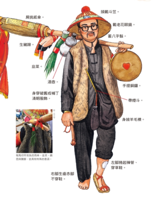 報馬仔裝扮涵義說明:長傘,常善;豬腳,知足;韭菜,長長久久;錫質酒壺,惜福;皮襖反穿,知冷暖;赤足,腳踏實地;紅纓斗笠,負責盡職;眼鏡,明辨是非;燕尾鬍,言而有信;紅心銅鑼,勞心勞力;菸斗,含煙、感恩之意;褲腳長短,不道人短長;疤痕,勿揭人瘡疤。